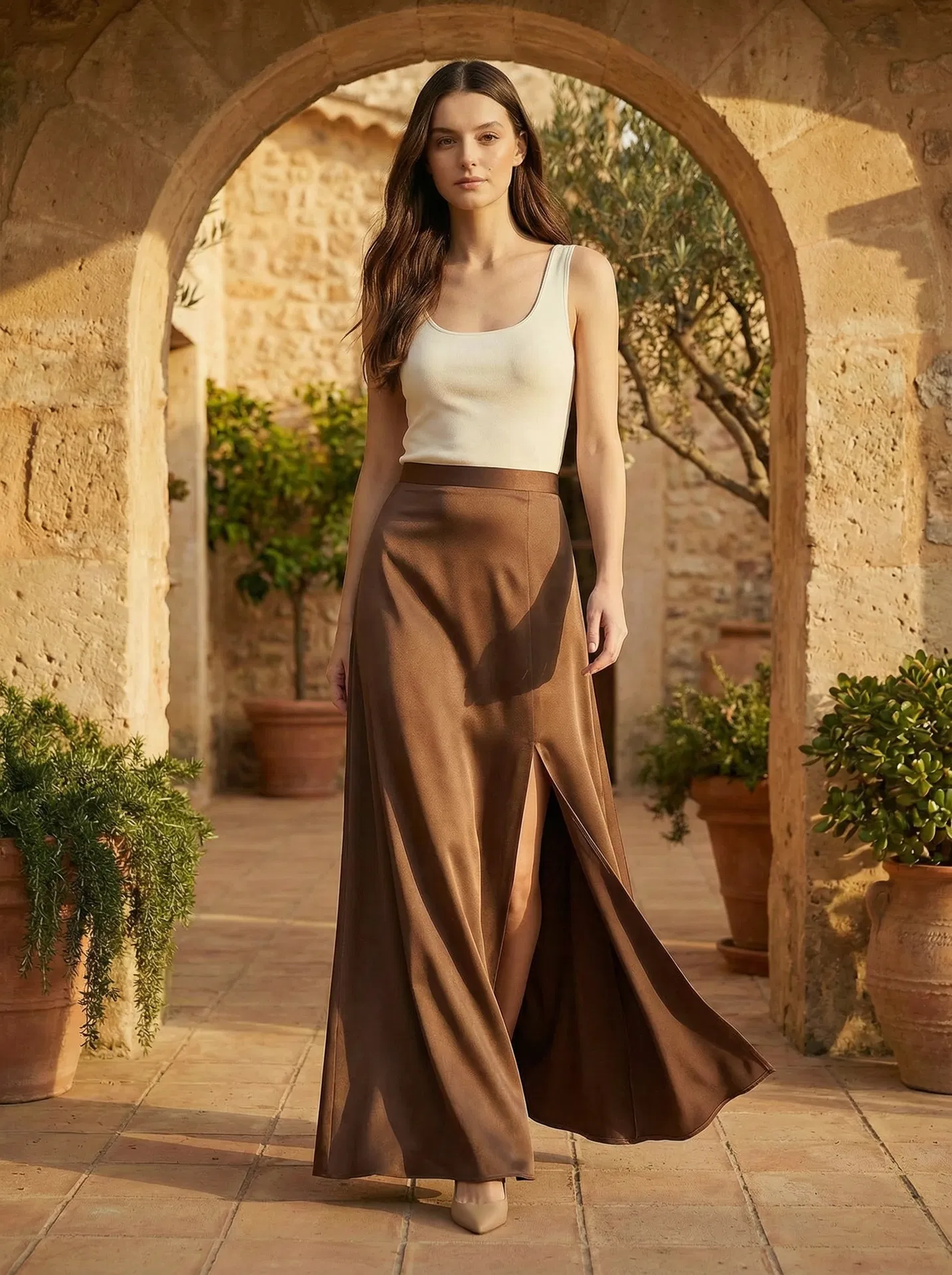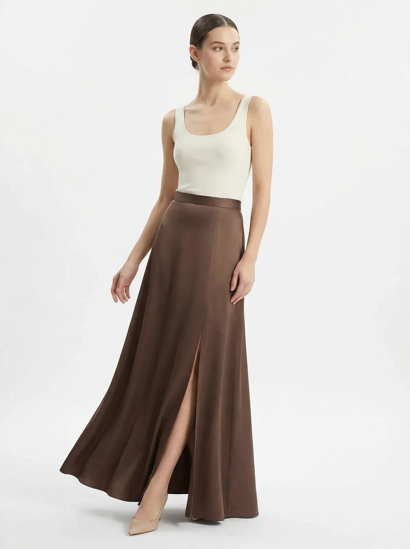 A sweeping maxi skirt in warm cacao mulberry silk with a flattering A-line silhouette and a daring front slit. The fitted waistband sits at the natural waist, while the bias-cut fabric flows effortlessly to the floor.