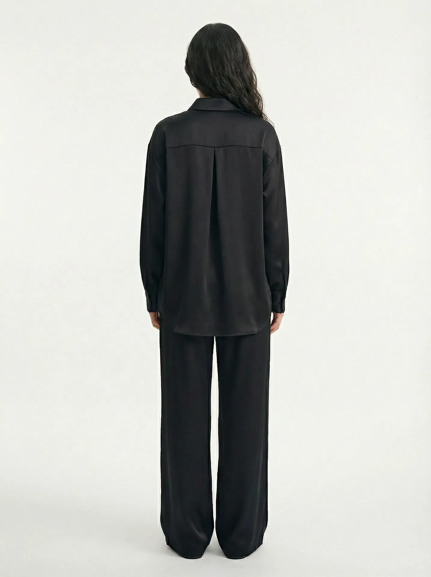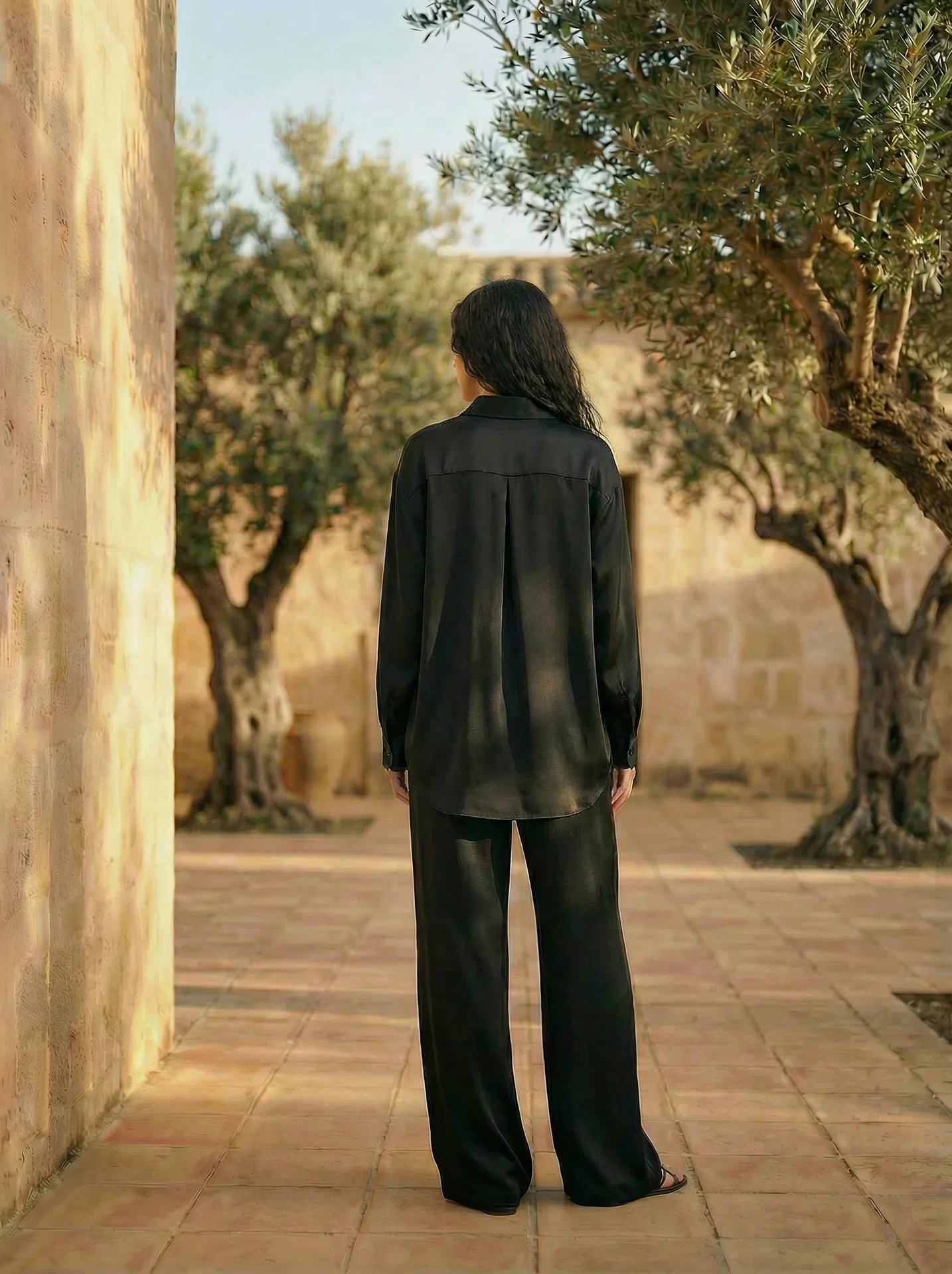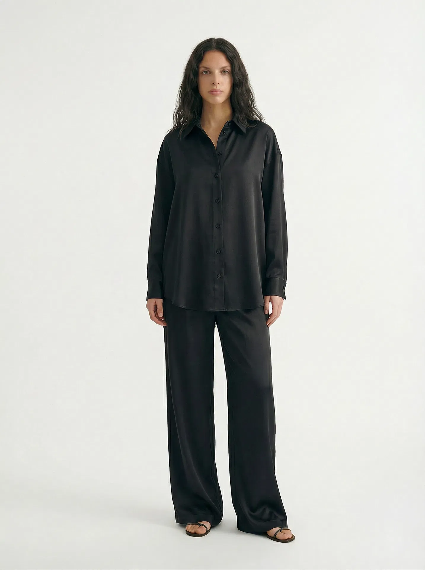 An oversized silk shirt in deep noir with a classic collar and tonal button-down front. The relaxed silhouette drapes effortlessly — sleek, sophisticated, and endlessly versatile, whether layered over a slip dress or paired with matching silk trousers.